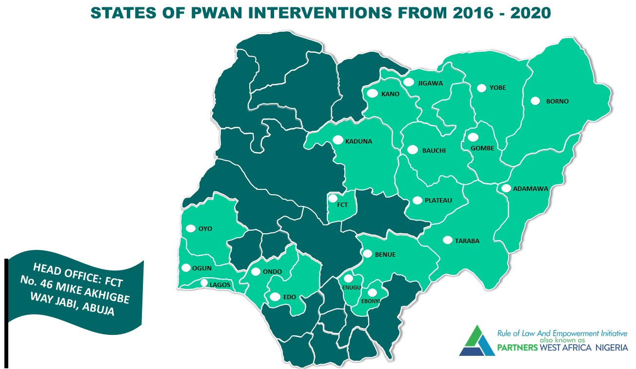 The Rule of Law and Empowerment Initiative also known as Partners West Africa Nigeria (PWAN) has carried out interventions in the following states: